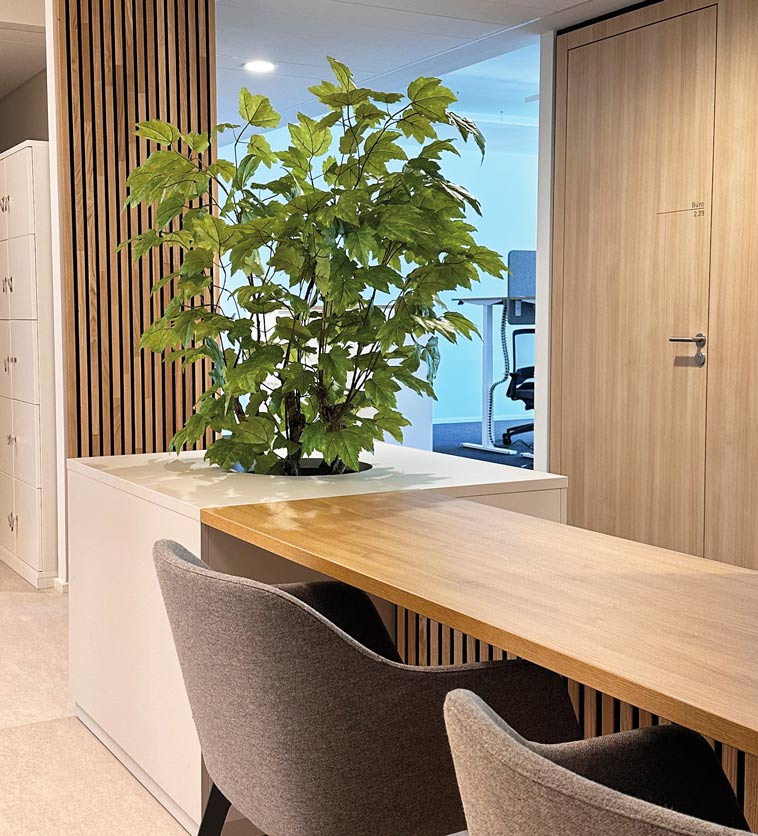 Bereits im Foyer empfängt Besucher und Mitarbeiter ein großzügiges, individuell gefertigtes Pflanzbecken aus Stahl. Es bildet den grünen Mittelpunkt des Eingangsbereichs und schafft eine einladende Atmosphäre. Ergänzt wird die Gestaltung durch großformatige Textilpflanzen, die in enger Abstimmung auf Höhe, Breite und Proportion der maßgefertigten Einbaumöbel angefertigt wurden. So entsteht ein harmonisches Gesamtbild, das Architektur, Möbel und Begrünung miteinander verbindet. Auf allen Etagen finden sich in den Kernzonen – den Meetingbereichen und Teeküchen – weitere Begrünungselemente, die die Räume auflockern und ein angenehmes Raumklima schaffen. Die ausgewählten Pflanzen tragen zu einer inspirierenden Umgebung bei, die Begegnung und Austausch fördert.
